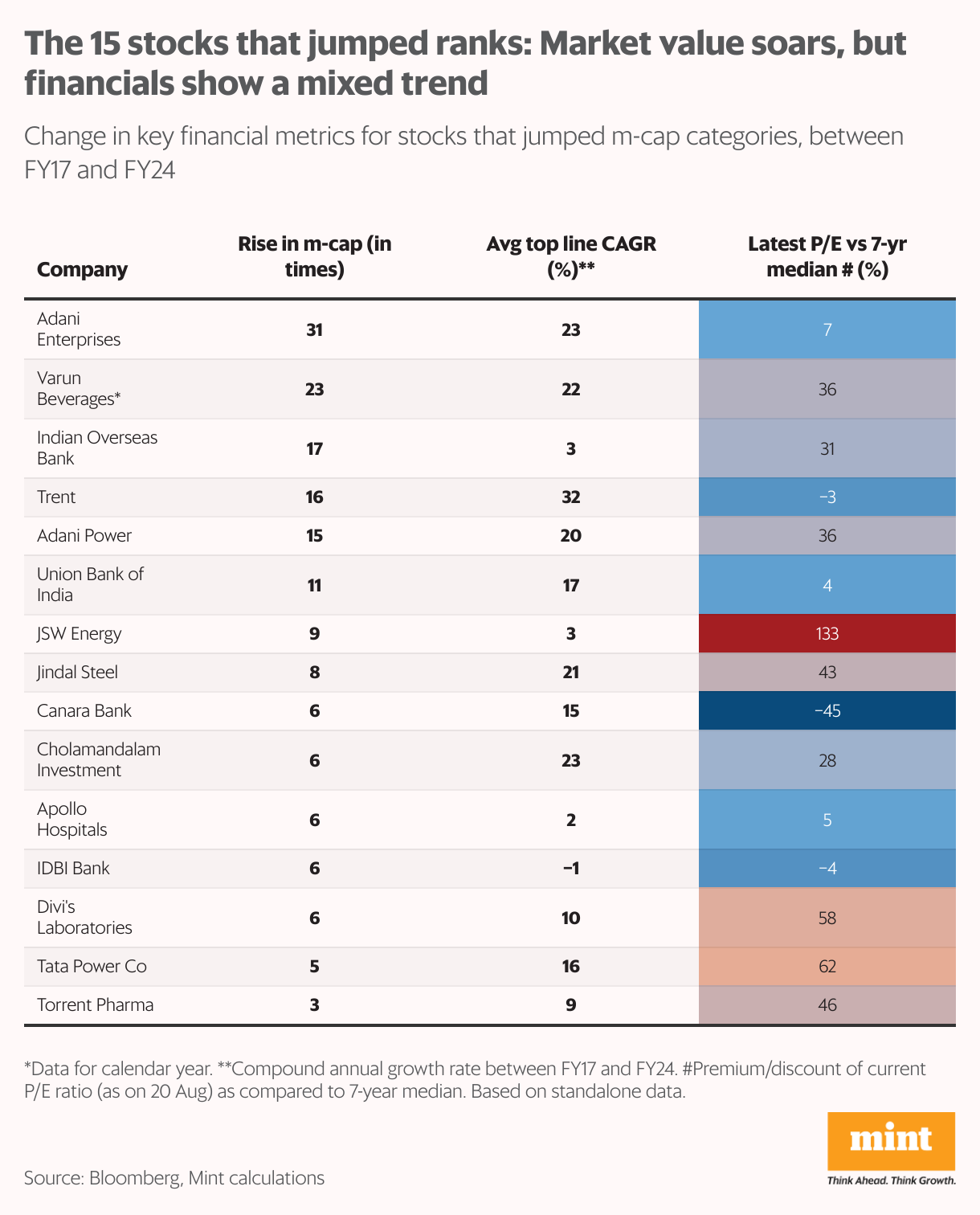 Between fiscal years 2017 and 2024, the collective market capitalization of the 15 firms that moved up the ranks to large-cap surged from 2.1 trillion to an impressive 19.6 trillion. Leading this surge are Adani Enterprises, Varun Beverages, Indian Overseas Bank, and Trent, whose market values skyrocketed by 30.5, 23.2, 17.3, and 16 times, respectively, over this period. However, this meteoric rise has sparked concerns about the sustainability and justification of these valuations, prompting a more cautious market outlook.