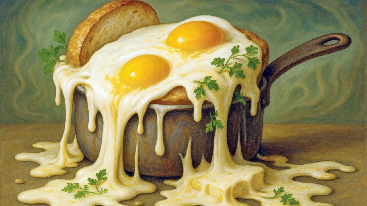 You should be looking at a breath-stopping breakfast spectacle of golden bread, sandwiching a savoury mixture, with a sunrise yellow egg yolk in the middle.