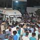 Workers from various pharma companies, workers association members, family members of workers who were injured in the blast that occurred in a pharma company at Achutapuram SEZ wait at the entrance of the company in Anakapalli on August 21, 2024